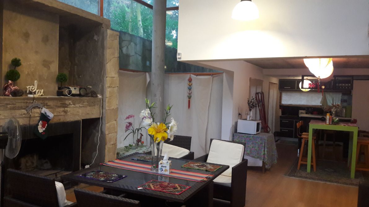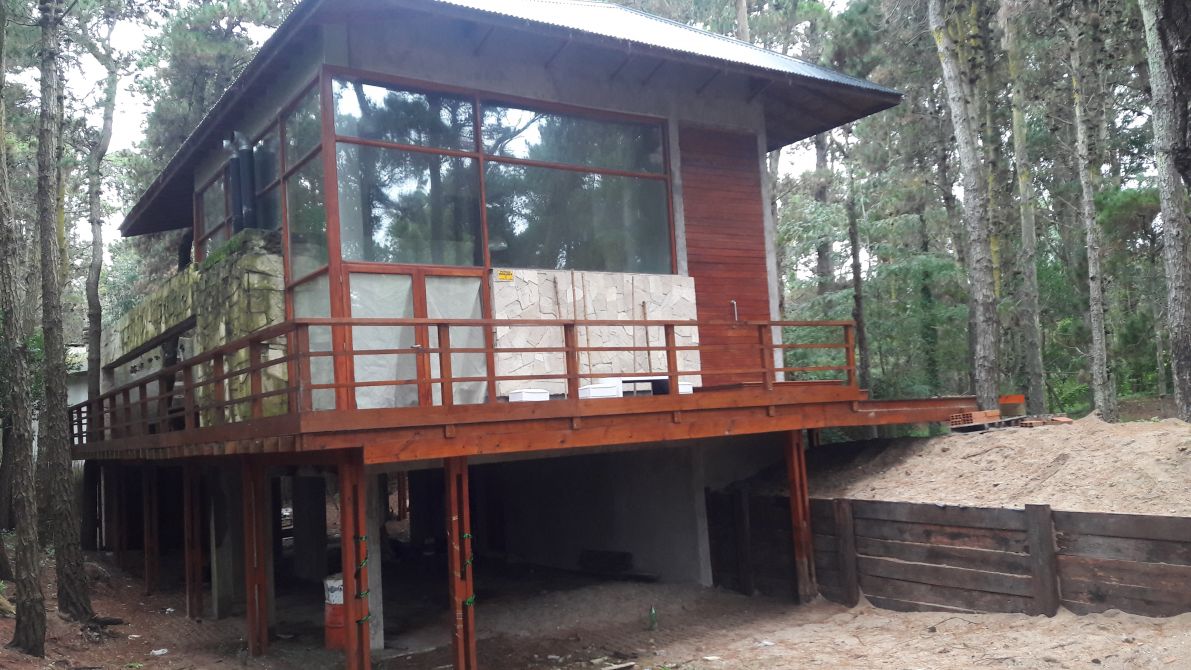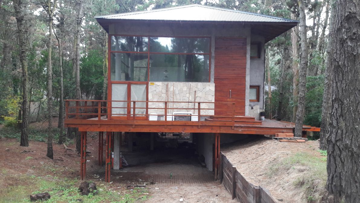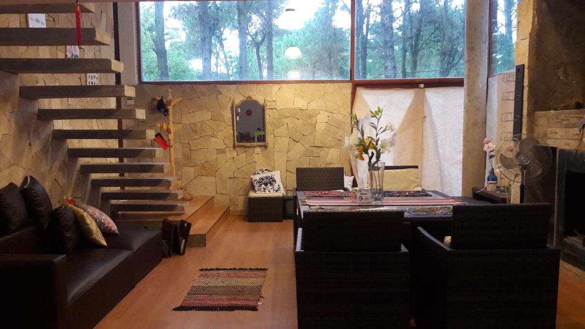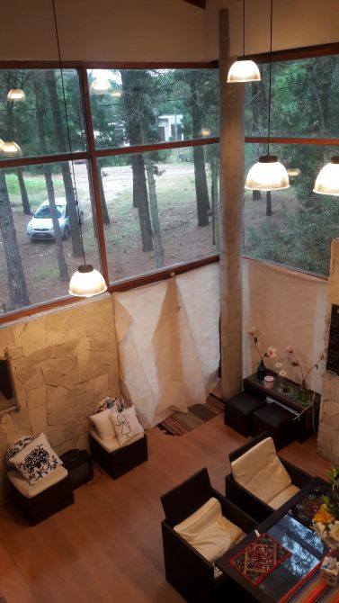 PLANTA BAJA: AMPLIA SALA DE ESTAR CON PAREDES REVESTIDAS EN PIEDRA, AMPLIOS VENTANALES VIDRIADOS CON VISTA AL BOSQUE, HOGAR, COMEDOR DIARIO, COCINA CON AMOBLAMIENTO DE BAJO Y SOBRE MESADA, BARRA DESAYUNADORA, BAÑO COMPLETO CON DETALLES DE CATEGORIA.